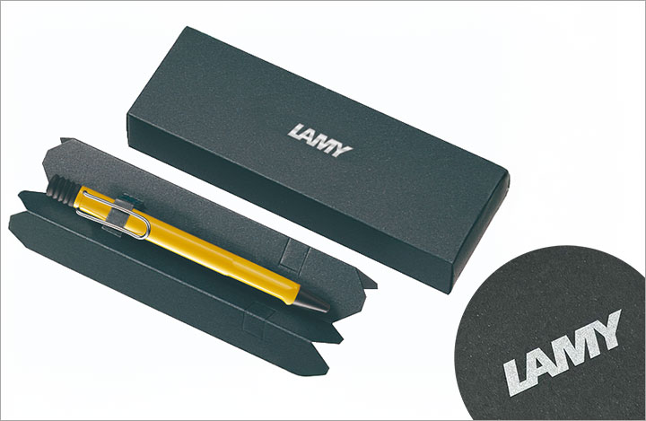 シックで上質な黒い厚紙のボックスに、メタリックシルバーで「LAMY」とロゴがプリントされています。