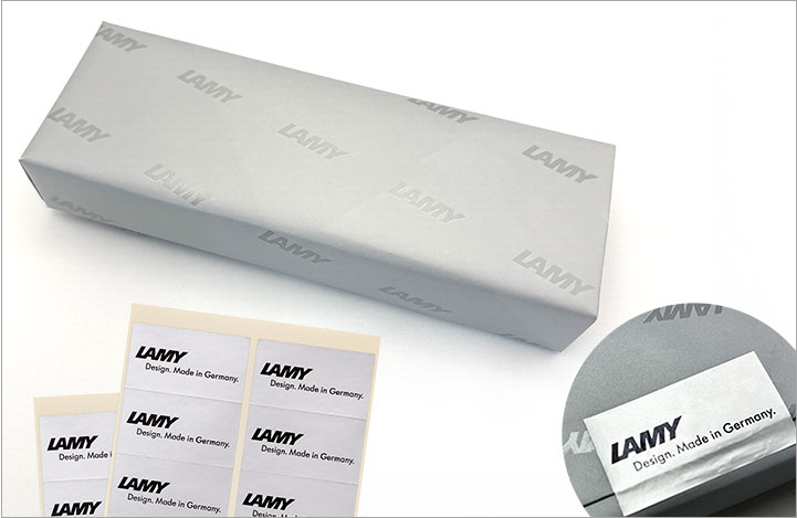 薄いグレー地に「LAMY」とロゴが総柄でプリントされている包装紙を、専用のシールで留めます。