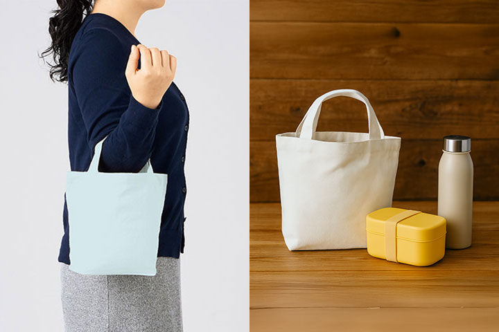 名入れ・ロゴ入れ可広めマチがお弁当用などにぴったりな、手頃なサイズのバッグ。厚手なキャンバス素材を使用しているため、耐久性に優れており日常的に使用するのに適してします。