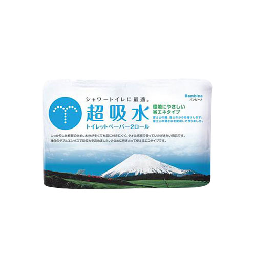バンビーナの2ロールダブル、超吸水トイレットペーパーは、富士山の湧水を使った再生紙100%の製品です。優れた紙質で、吸水力抜群なのに肌に付きにくく、巻取り少な目でエコに使えます。