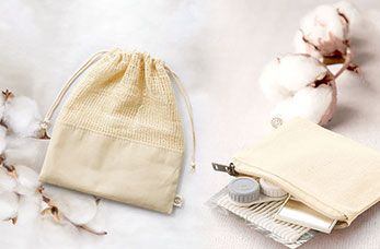 名入れ・ロゴ入れ可Mサイズの非常にシンプルながら風合いの良いオーガニックコットン素材のギフト巾着。3.5オンスの比較的薄手な素材のため、コットン生地ながらも軽量で、ショッパーなどにもおすすめです。