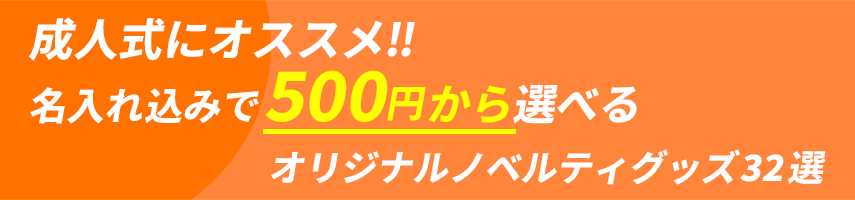 オリジナルの名入れ印刷代込みで、500円程度で製作できる、おしゃれで実用的な、成人式のノベルティグッズ向き商品を厳選しました。高品質で、デザインにも機能性にもこだわった、成人式の記念品にぴったりなアイテムが揃います。個性的なデザインで製作することも可能ですので、お気軽にご相談ください。