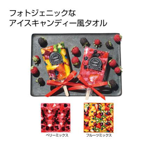 アイスキャンディーのようなパッケージデザインと、本体のフルーツデザインがとっても可愛らしいハンドタオルです。イベント等でのノベルティ用や特典用におすすめのアイテムです。