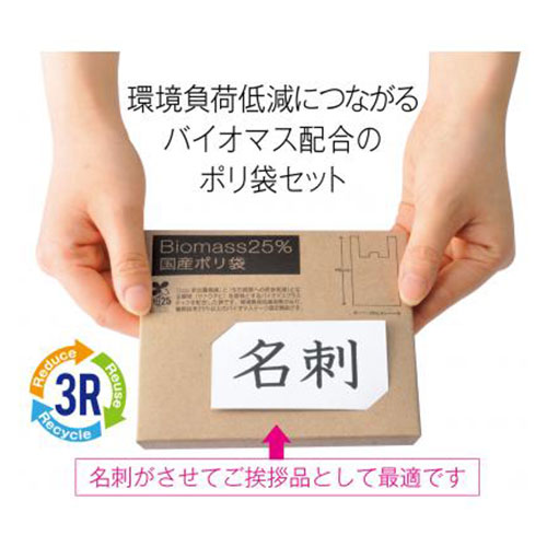 サトウキビを原料とするバイオマス配合素材を使用しているため環境負荷低減に繋がり、SDGsに貢献できる国産ポリ袋8枚入りです。イベント等でのばらまき用やノベルティ用に最適。