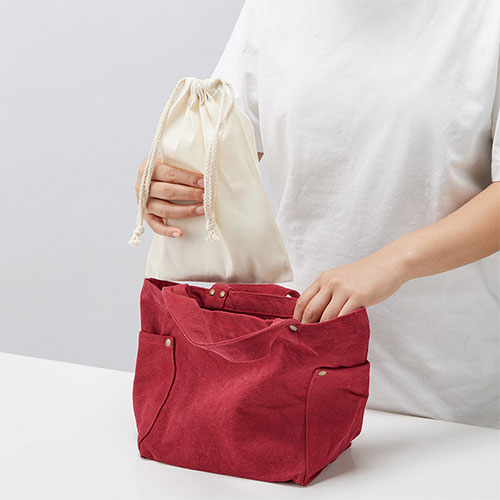 災害発生時に避難所で役立つアイテムを、名入れができるコットン巾着袋に収納した6点セット。通勤通学用のバッグにも収納しやすいサイズ感です。防災啓発のノベルティに最適です。