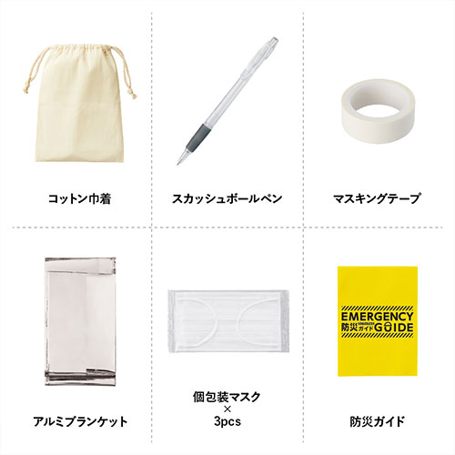 素材 巾着/コットン マスク/不織布(PP) 他 アルミブランケット/アルミ蒸着PET 防災ガイド/紙 マスキングテープ/ スカッシュボールペン/ABS、AS 他サイズ 巾着/175×240(mm) マスク/約165×95(mm) アルミブランケット/約700×1400(mm) マスキングテープ/約15×2000(mm) スカッシュボールペン/約144(mm)防災ガイド/70×105(mm)(mm)包装 PE袋備考 取説付