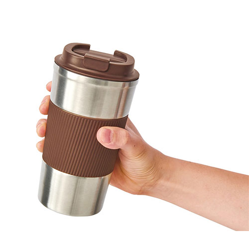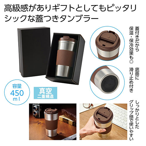 贈答・贈呈品に最適なギフトボックス入りの、蓋付き真空ステンレスタンブラー。容量はたっぷり450mlで、底面にはすべり止め、胴部にはしっかり持ちやすいシリコンカバーを装備しています。