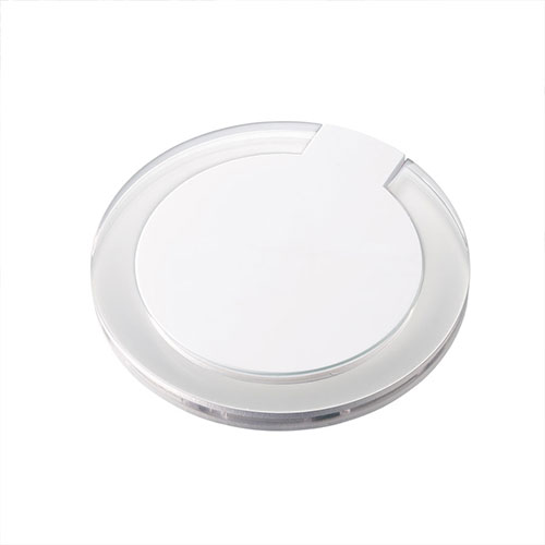 ラウンドタイプのワイヤレス充電器。Qi規格対応のスマートホンなら置くだけで充電可能です。クリア仕様で充電中は青色に光るため見た目にも格好良いアイテム。販促用にも人気です。