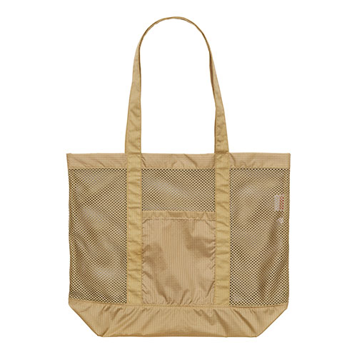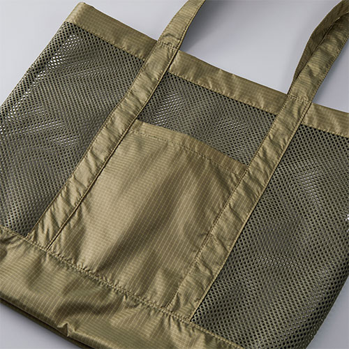 ナイロン100%のリップストップ生地と、メッシュを組合わせたトートバッグ。A4サイズの本などもしっかり収納できて、持ち手が長めで肩掛けしやすくデイリーユースにピッタリです。