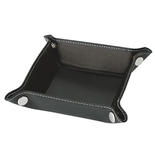 カギやアクセサリー置きにぴったりの、高級感あるレザー素材のトレイです。四隅のボタンを外せばフラットになり、折りたたむことも可能です。ネイビーとブラックからお選びください。