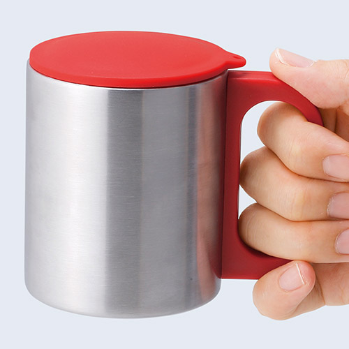 ステンレス二重構造に加え、専用のフタ付きで保冷保温効果が非常に高いマグカップです。カラーはレッド、オレンジ、カーキ、ネイビー、ブラックの全5色からお選びいただけます。