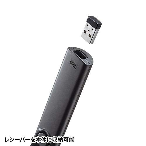 素材 ABS樹脂サイズ 本体/W28.5×D140×H16.5mm、レシーバー/W12.5×D19.46×H6.6mm重量 本体/約30g、レシーバー/約2g機能 ■ワイヤレスでPowerPointのページ操作が可能なので、手で持ったまま操作ができる。歩きながらのプレゼンも可能。 ■大型ボタンでカンタン操作、しかも専用ドライバー不要の簡単接続です。 ■レシーバーを本体に収納できるので、コンパクトに持ち運び可能。付属品 レシーバー、単四乾電池(テスト用)×1、取扱説明書、保証書備考 ■対応規格(コネクタ):USB HID仕様Ver.1.1準拠 ※USB3.1/3.0/2.0インターフェースでも使用可能。 ■電源:単四乾電池×1 ■対応機種:Windows搭載(DOS/Vパソコン)、Apple Macシリーズ ※但し標準でUSBポート(Aタイプコネクタ)を装備し、1つ以上の空きがあること。 ■対応OS:Windows 11・10・8.1・8、macOS 13(Ventura)・macOS(Monterey)12・macOS(BigSur)11、macOS 10.13〜10.15 ■対応アプリケーション:Microsoft PowerPoint 2013・2016・2019、Microsoft PowerPoint for Mac 2016・2019、Keynote 7.2〜 (Mac OS X 10.10.4以降) ※Microsoft PowerPoint for Mac、Keynoteではスライドショーの利用不可。