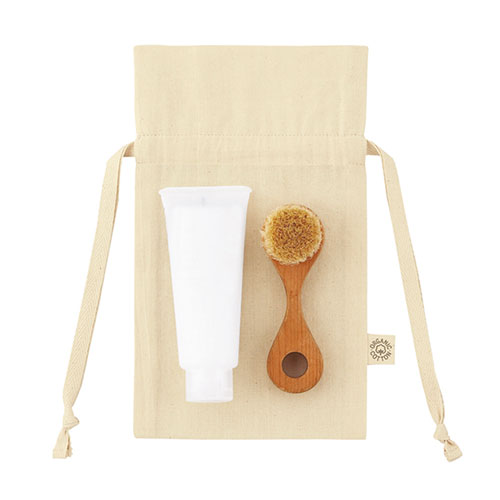 Sサイズの非常にシンプルながら風合いの良いオーガニックコットン素材のギフト巾着。3.5オンスの比較的薄手な素材のため、コットン生地ながらも軽量で、ショッパーなどにもおすすめです。