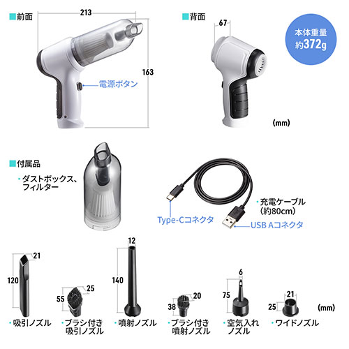 サイズ W67×D213×H163mm重量 約372g付属品 吸引ノズル、ブラシ付き吸引ノズル、噴射ノズル、ブラシ付き噴射ノズル、空気入れノズル、ワイドノズル生産国 中国注意事項 ※排気口/吸気口をふさがないでください。※車内や高温になる場所には保管しないでください。備考 バッテリー:リチウムイオン電池 使用可能時間:最大約12分〜20分 消費電力:60W 充電時間:約4時間(1Aの場合) 電池容量:7.4V 2000mAh