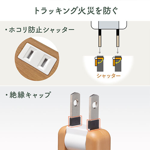 カラー展開 ダークブラウン木目・ライトブラウン木目サイズ 約W350×D45×H26mm重量 約460g生産国 中国備考 プラグ:2P(絶縁キャップ付きスイングプラグ) 差込口:2P・6個口(シャッター付き) コード長:約2m