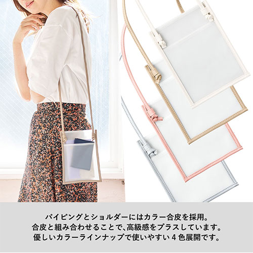 紫外線や水に強く、耐久性や柔軟性に優れたEVA素材を使用した、透け感がオシャレなサコッシュです。焼却してもダイオキシンが発生しない、環境にも優しいアイテムです。