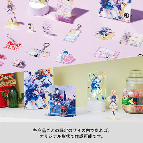 一見普通のSサイズアクリルスタンドですが、台座と連結させることでキーホルダーとしてバッグなどに取り付けて持ち歩くこともできるアイテム。デザインに合わせて形状も精巧に切り抜きます。