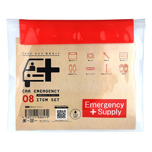 9点セットの、車のグローブボックスやダッシュボードの収納可能な防災ポーチです。コンパクトサイズなため邪魔になりにくく、なおかついざという時に必ず役立つアイテムです。
