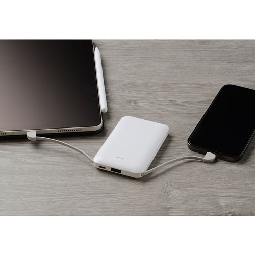 手のひらサイズに加えケーブル一体型のすっきりとしたデザインのため、持ち歩きにも便利な上、どんなオリジナル名入れもよく映えるモバイルバッテリーです。ノベルティ用におすすめ。
