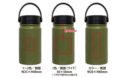 フタにはハンドルが付いているため持ち運びに便利な350mlサイズのサーモボトルです。真空二重構造のステンレス素材で保冷保温効果が高く、大きな飲み口は氷も簡単に入れられます。