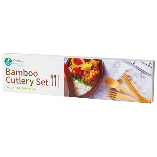 お箸、スプーン、フォークのオシャレでナチュラルなバンブー風カトラリーセットです。専用の入れ物にはオリジナルデザインの名入れプリントが可能なため販促用などにもおすすめ。