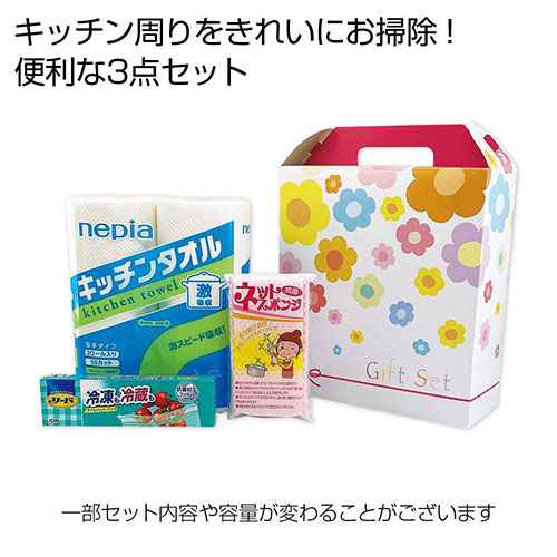 包装 持ち手付化粧箱入り備考 <セット内容> ・ネピア激吸収キッチンタオル2ロール(50カット)×1 ・ライオンリード冷凍も冷蔵も新鮮保存バッグS3枚×1 ・ネットスポンジ×1