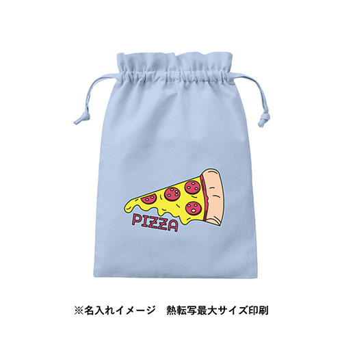 Tシャツなどの衣類も収納できるLサイズの巾着。厚手コットン生地で口元のフリルデザインもかわいらしく、旅行用ポーチにも使えます。フルカラー印刷OKでノベルティ・物販品などに最適です。