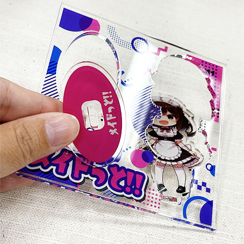フレーム部分にもフルカラーでオリジナルデザインをプリントできるアクリルスタンド。組立てたアクスタをバラして再び収納すれば、バッグに入れてもかさばらず持ち運びに便利です。