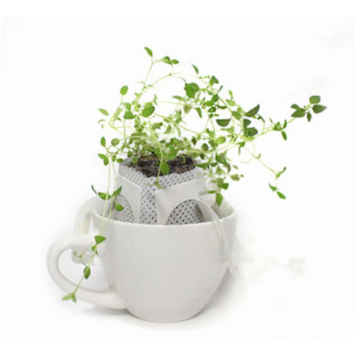 お手持ちのカップにドリップコーヒーのようにセットして、水をあげるだけでハーブ栽培が楽しめるキット。ドリッパーなので余分な水分は下に落ち、水をあげすぎることもありません。