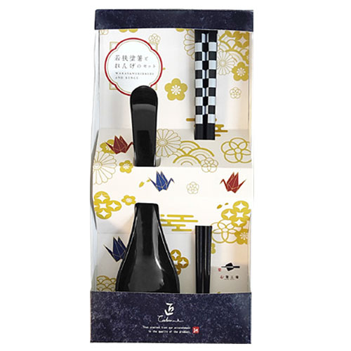 伝統的な和柄である市松模様を使った上品なデザインの箸とレンゲのセット。オリジナルデザインの名入れプリントが可能です。カラーは黒と朱の2色展開からお選びいただけます。