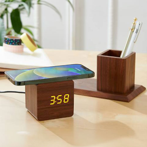 温かみのある木製風のデザインがおしゃれなペン立てとデジタルクロック。デジタルクロックの上部ではスマホのワイヤレス充電も可能で、見た目以上に機能的。記念用等にもおすすめです。