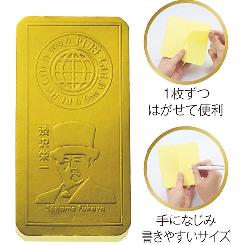 渋沢栄一の刻印と輝くゴールドの色合いがインパクト抜群なメモ朝です。使いやすいサイズ感のため喜ばれやすいアイテム。イベントやキャンペーンのノベルティ用に人気です。