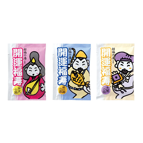 可愛らしいタッチで描かれた恵比寿様、大黒様、弁天様のイラストが目を引く、開運招福の入浴剤です。3種取混ぜのためどれが出るかはお楽しみ。年始イベントのノベルティなどにおすすめ。