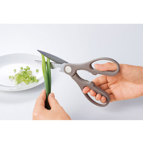 キャップオープナー、栓抜き、目盛りまでついた、キッチン仕事に非常に便利なハサミです。専用ケースの裏面はマグネット仕様となっているため、冷蔵庫の壁面などにも貼り付けられて便利です。
