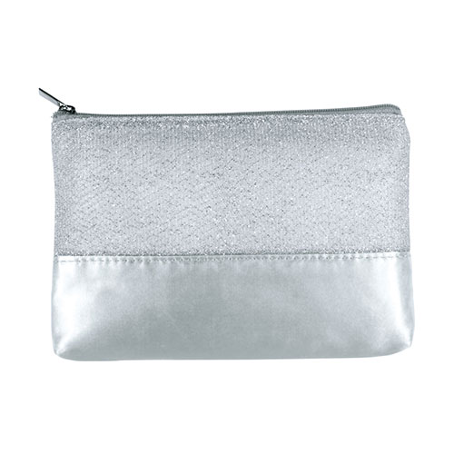 シンプルながら高級感のあるラメデザインのポーチです。ピンクゴールド、ゴールド、シルーの三色ラインナップからお選びいただけます。名入れプリントも可能なため販促用にもおすすめ。