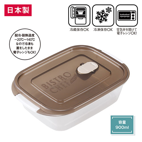 900mlサイズの保存容器です。フタには空気弁が付いているため、そのまま電子レンジに入れることも可能で大変便利です。イベント等で配布するノベルティ用としてもおすすめ。