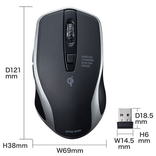 スマホのワイヤレス充電器の上に置くだけで充電ができる、Qi規格準拠のワイヤレスブルーLEDマウス。付属の専用ケーブルを使えば、充電が切れても、操作しながら充電することが可能です。