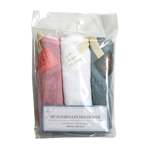 吸水性にも速乾性にも優れたマイクロファイバー素材のキッチンダスター3P。毎日のキッチン仕事やお掃除に非常に便利なため、イベント等で配布するノベルティ用として人気があります。