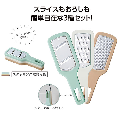 用途に合わせて3種類のスライサーを使い分けられるセットアイテムです。スタッキングでコンパクトに収納可能な点も非常に便利。イベントやキャンペーンの特典用などにもおすすめ。