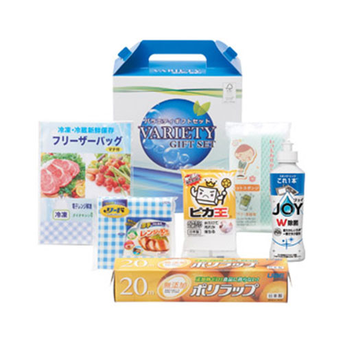 キッチンペーパーや食器用洗剤、ラップ、フリーザーパックなど、毎日のように使う日用消耗品のギフトボックス。ご挨拶用はもちろん、イベント等の景品用などにもおすすめです。