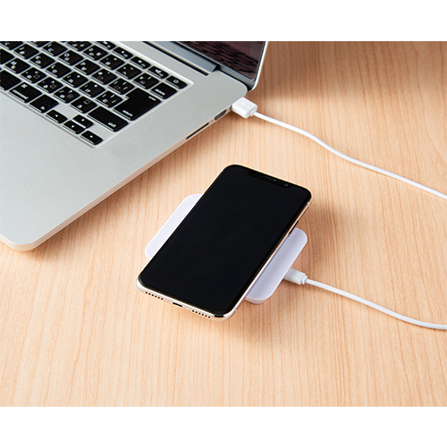 Qi規格対応スマートフォンなら置くだけで充電することができ、またスマホスタンドとしても利用できちゃう便利アイテムです。フルカラーの名入れプリントが可能なため、販促用にも是非!