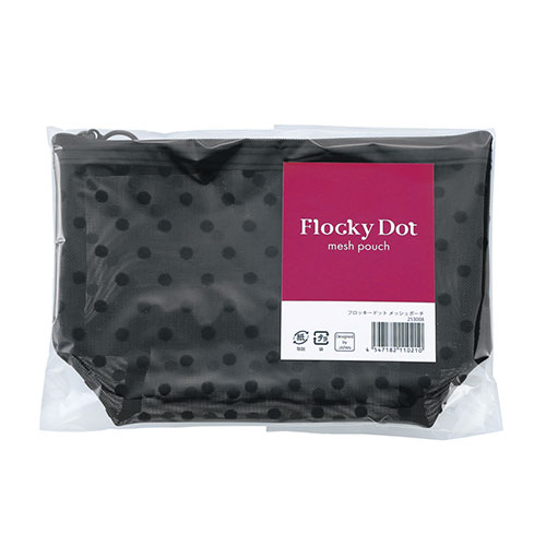 メッシュ素材で中に入れたものがひと目でわかるポーチです。ブラックで統一されたカラーとドット柄が、大人な印象ながらもどこか柔らかさがあり上品なデザインです。ノベルティ用におすすめ。