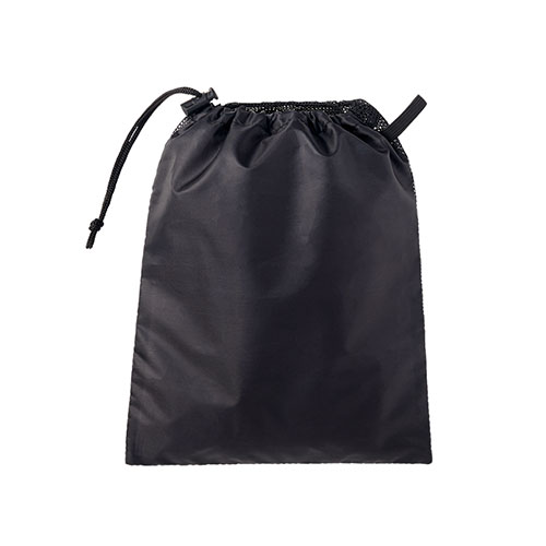 Mサイズのシンプルな巾着です。片面は中身が透けて見えるメッシュ素材、もう片面はフラットポリエステルでオリジナルの名入れプリントも可能です。ノベルティ用やショッパーにおすすめ。