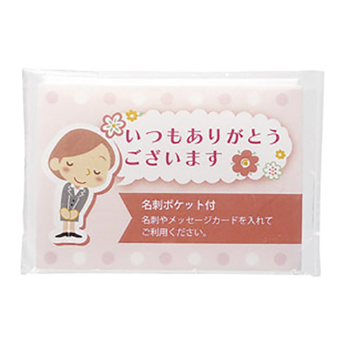 「ありがとう」の気持ちを込めて渡すのにはぴったりなポケットティッシュです。名刺ポケット付きですのでご挨拶用などにもおすすめ。カラーバリエーションは3色あるのでお好みで。