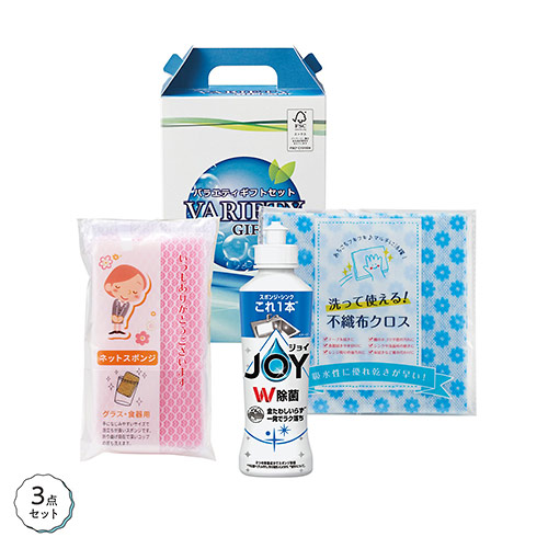 食器用洗剤、食器洗い用スポンジ、不織布クロスといった、キッチン仕事に必要不可欠なアイテム3点を詰め合わせたギフトセットです。二種類のパッケージデザインからお選びください。