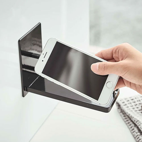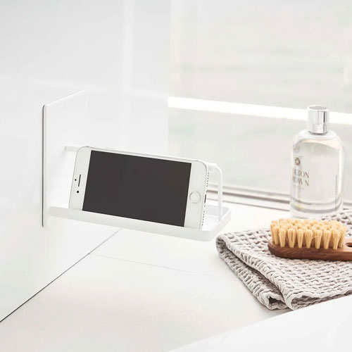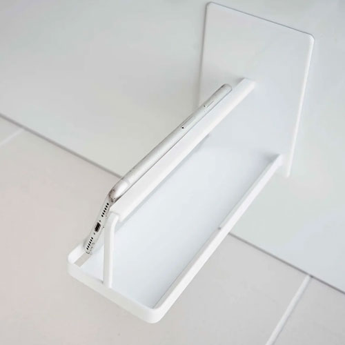 お風呂の壁に、強力マグネットでペタっと貼り付けるだけで簡単に使うことができるスマートフォンスタンドです。カラーバリエーションはホワイトとブラックの二色展開から選択可能。