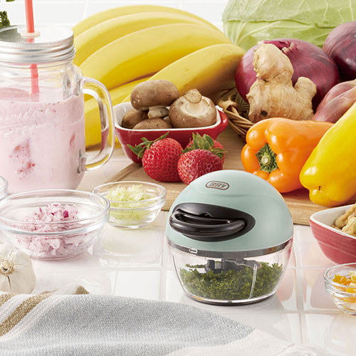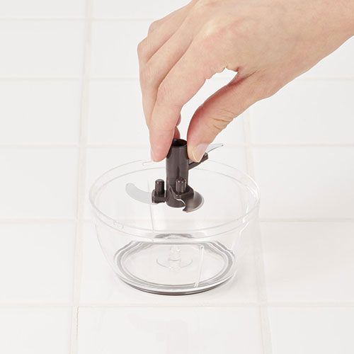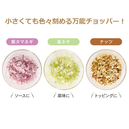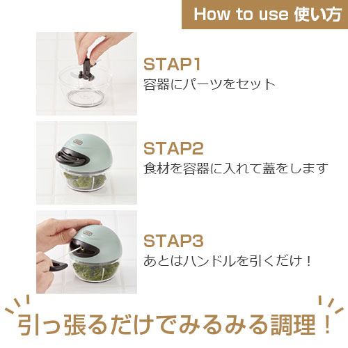 電源を必要とせず、ハンドルを引くだけで中に入れた食材をしっかり刻んでくれるハンディチョッパー ナノ。薬味をはじめとする様々な食材を、必要な分だけ、手を汚さずに細かくできます。