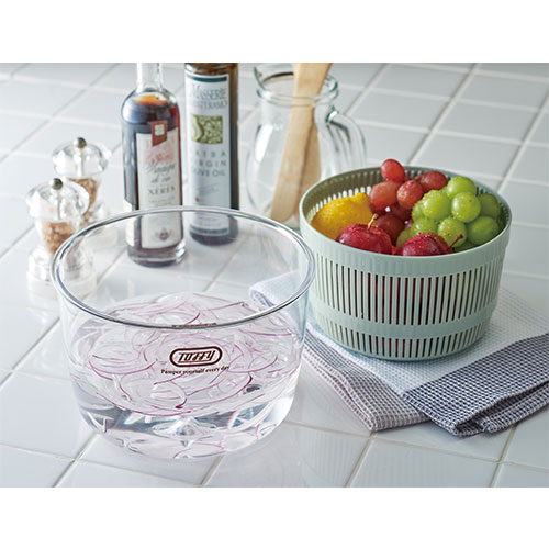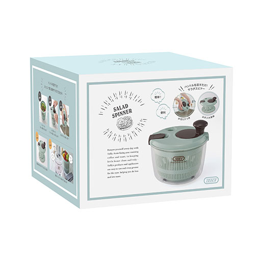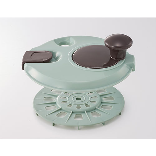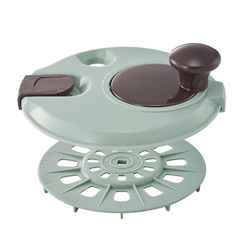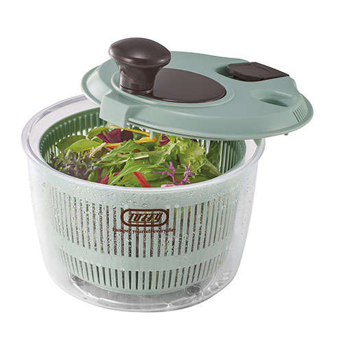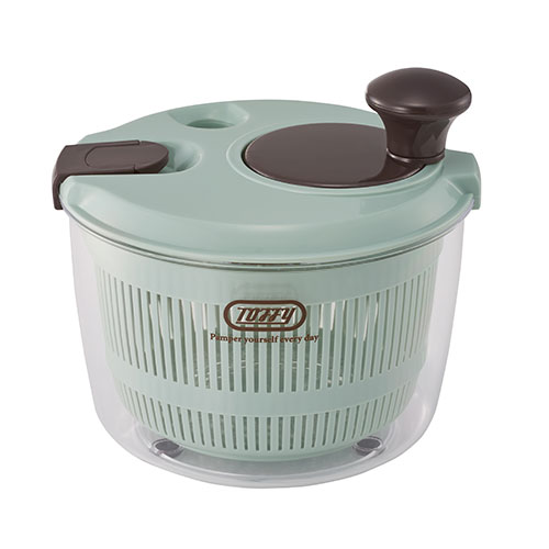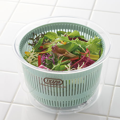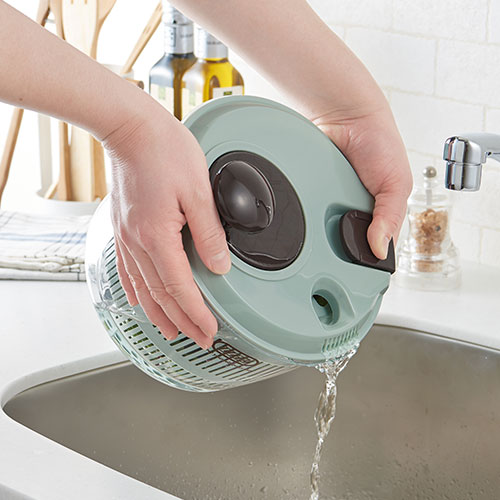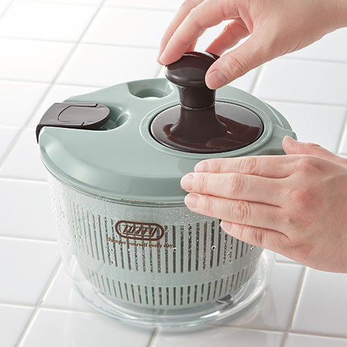 洗った野菜をバスケットに入れ、ふたをしてハンドルを回すと水が切れるため、その水を穴から捨てたら完了で、あっという間に新鮮サラダができる非常に便利なサラダスピナーです。
