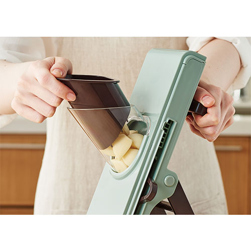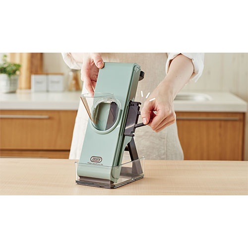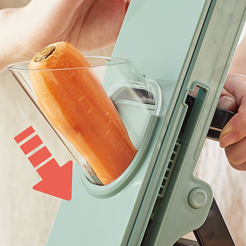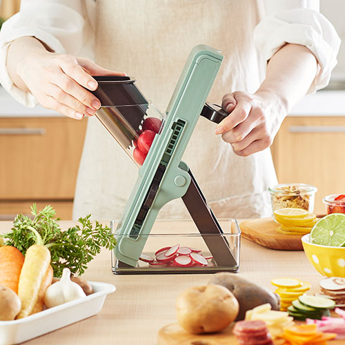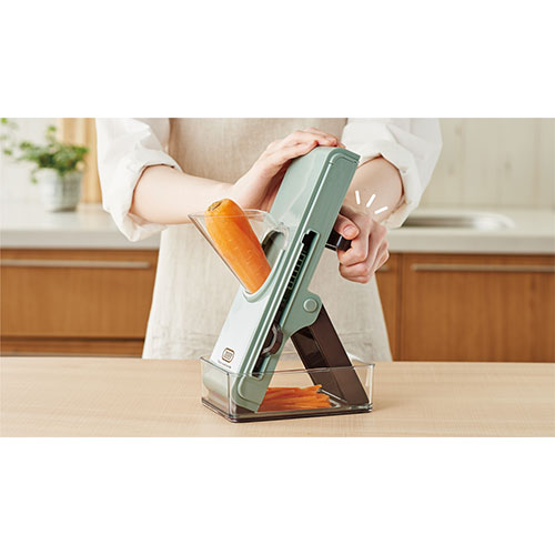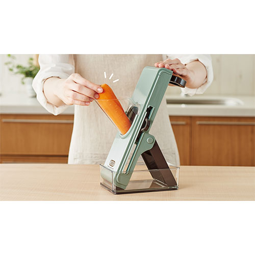 ニンジンやダイコンなどをセットしてハンドルを回すだけで平切りや細切り、千切りなどまでできるスライサーです。刃に触れにくいため安全に調理が可能。使用後はコンパクトに折り畳めるのも◎!