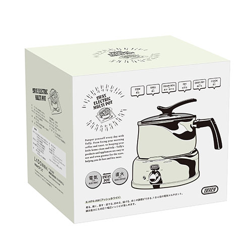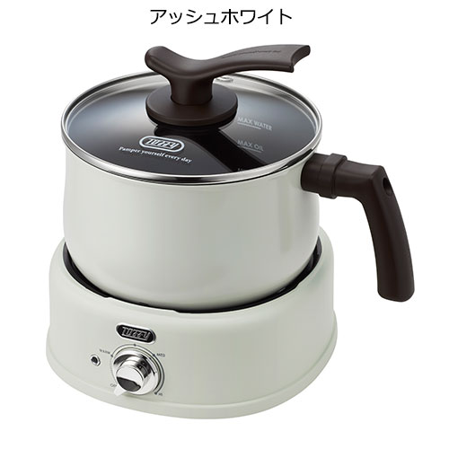 カラー展開 全2色サイズ 約275(W)×250(H)×220(D)mm容量 満水容量:2.5L重量 約1,790g ※鍋・ガラス蓋使用時(電源コード含まず)機能 電源:AC100V 50-60Hz定格消費電力:1000W電源コード長:約1.2m温度調節:保温〜約240度付属品 ガラス蓋、電源コード、ユーザーズガイド(保証書含む)